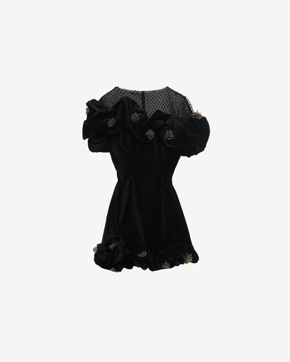 Structured ruffles with bead embroidery on the low-cut neckline and hem with a 'firework' effect