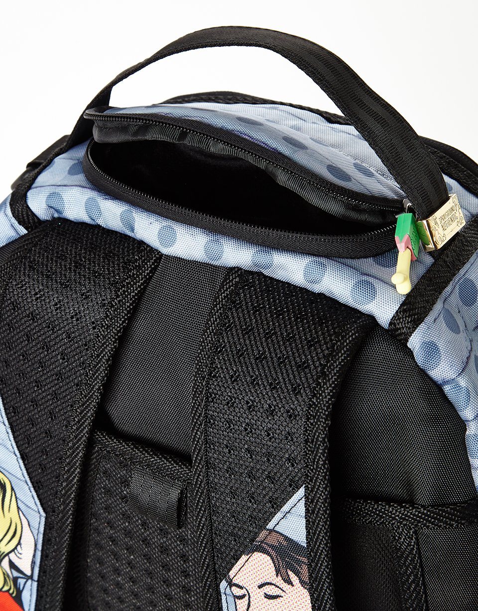 ExteriorDimensions: 18' x 6' x 11.5' _ Front zipper pocket_ Side pockets _ Zippered Stash pocket _ Ergonomic mesh back padding _ Adjustable Straps for custom sizing _ Nylon Zippers with Metal Hardware _ Metal 'Sprayground Authentic' badge _ Slide through back sleeve connects to Carry on luggage to free your hands